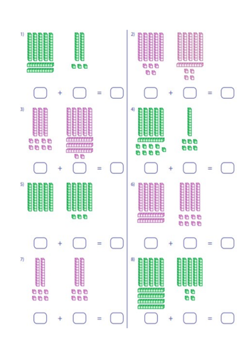 Base Ten Blocks Base ten blocks worksheets that teach basic addition, subtraction, number sense and place value using visual representations of quantity.